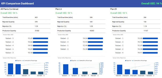 Manufacturing KPI tracking with OEE metrics, production monitoring, and cross-plant performance comparison analytics